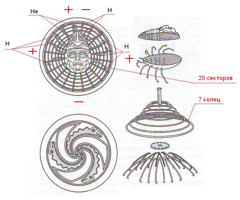 Эта часть материала является результатом исследования ряда артефактов племён Центральной Америки, Перу и Боливии. Мы старались дать его в такой последовательности, которая лучше позволила бы его усвоить. В процессе исследования была принята одна версия, которая впоследствии полностью подтвердилась и позволила считывать информацию и технологии с множества артефактов. В этой части мы расскажем о действительной «работе» Солнца и процессах, проходящих на его поверхности. Нами будет дана расшифровка барельефа с плиты Паленке, виды этой конструкции и объяснение принципа её работы. Перед вами схема экваториального магнитного поля Солнца с нейтральным сектором, занявшим минусовой полюс. Нейтральный сектор движется через все полюса в направлении, противоположном их движению (навстречу). | ||||||